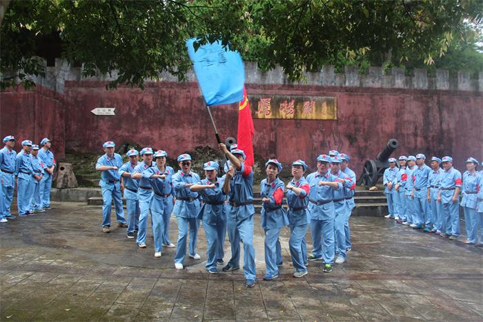 “七一”前夕,城投集團(tuán)全體黨員身穿紅軍裝,頭戴紅軍帽,腰系紅軍帶,分乘兩部大巴,雄赳赳氣昂昂前往鷹揚(yáng)關(guān)。