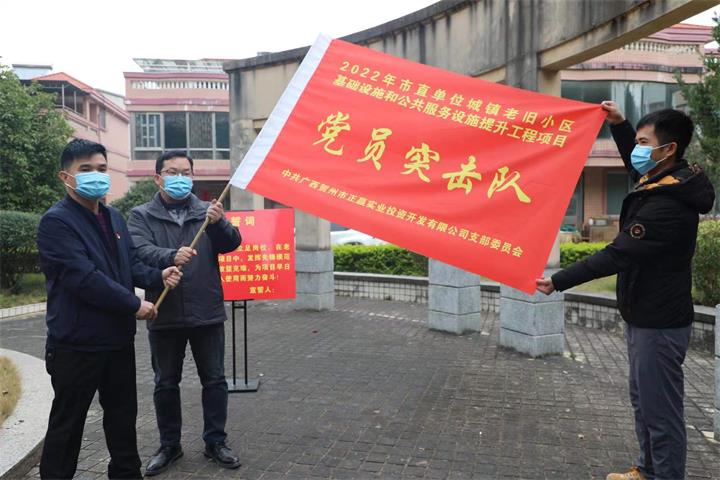 隨后,活動人員來到了賀州市檢察院生活小區(qū),該小區(qū)是正贏實業(yè)公司負責實施的賀州市2022年市直單位城鎮(zhèn)老舊小區(qū)基礎設施和公共服務設施提升工程項目其中一個老舊小區(qū)。在老舊小區(qū)現場,支部開展了黨員對標承諾活動,并成立了2022年市直單位老舊小區(qū)基礎設施和公共服務設施提升工程項目“黨員突擊隊”。柳國忠強調,全體黨員要通過向身邊的優(yōu)秀黨員學習并從中確立標桿和榜樣,在項目建設中以黨員的標準嚴格要求自己,帶頭攻堅克難,沖鋒在項目一線,更好的為人民群眾服務。